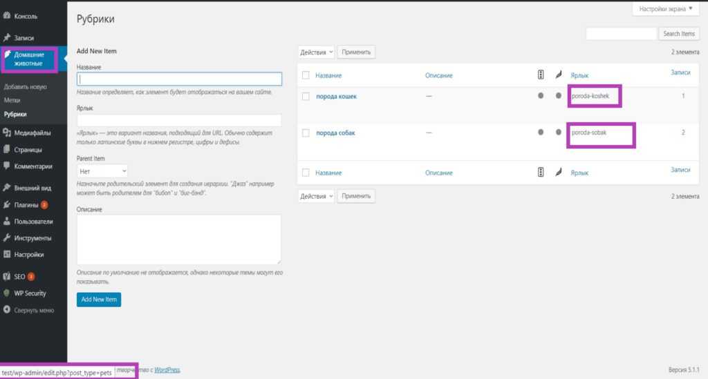 (Быстрый совет: если вы наведете указатель мыши на пользовательскую таксономию в левом меню на панели мониторинга и посмотрите в нижней части окна браузера, небольшое всплывающее окно даст вам подробную информацию о том, какой тип записи и как называется таксономия.)