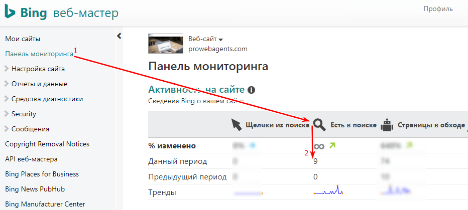 Bing Webmaster – Панель мониторинга – Активность на сайте – Есть в поиске в данный период.