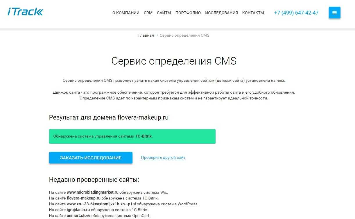 Отечественная компания, которая занимается разработкой сайтов на заказ. В своем распоряжении он имеет небольшой сервис по определению CMS. Работает на ура. Для того, чтобы им воспользоваться, вам нужно будет войти на Itrack.ru и в специальную строку вписать адрес сайта, после чего нажать «Определить CMS». Поверьте, результат не заставит себя ждать.