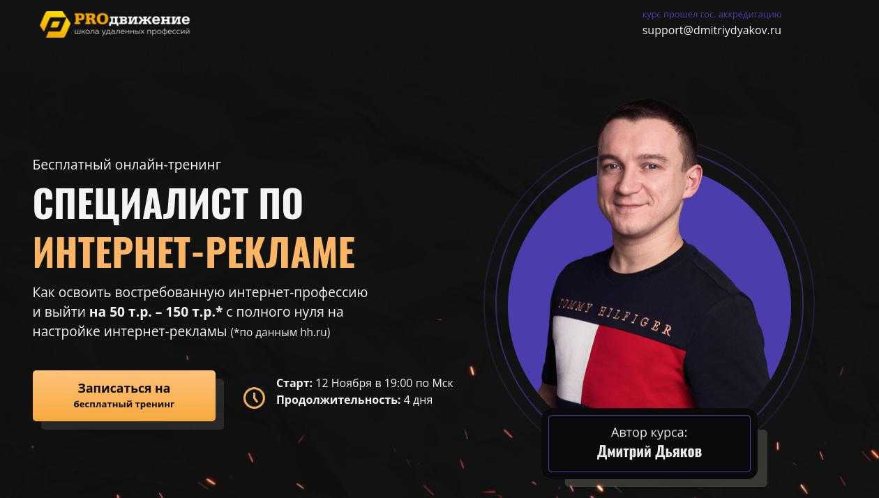 Обучающая программа: обучение включает детальное изучение рынка рекламы и профессии. Дмитрий опишет преимущества и недостатки, расскажет об ошибках новичков и поможет подготовить план развития. Никаких предварительных знаний не нужно. Все что от вас требуется – желание учиться, внимательное изучение материалов тренинга.
