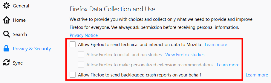 Firefox по умолчанию делится «техническими данными и данными об активности пользователя» с Mozilla. Это включает в себя возможность проводить различного рода исследования, среди которых анализ активности вашего ПК. Узнать больше о подобного рода исследованиях можно здесь. Помимо этого, также есть , на которой идет речь о методах сбора данных компанией Mozilla. В любом случае, мы рекомендуем вам отключить данные функции.