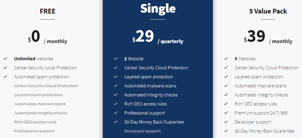 Тарифы плагина Cerber Security.