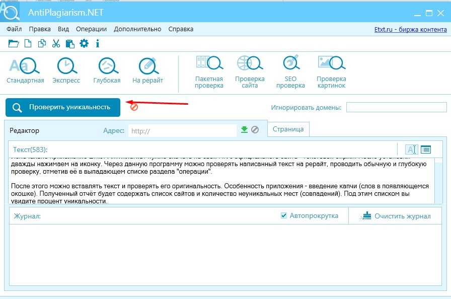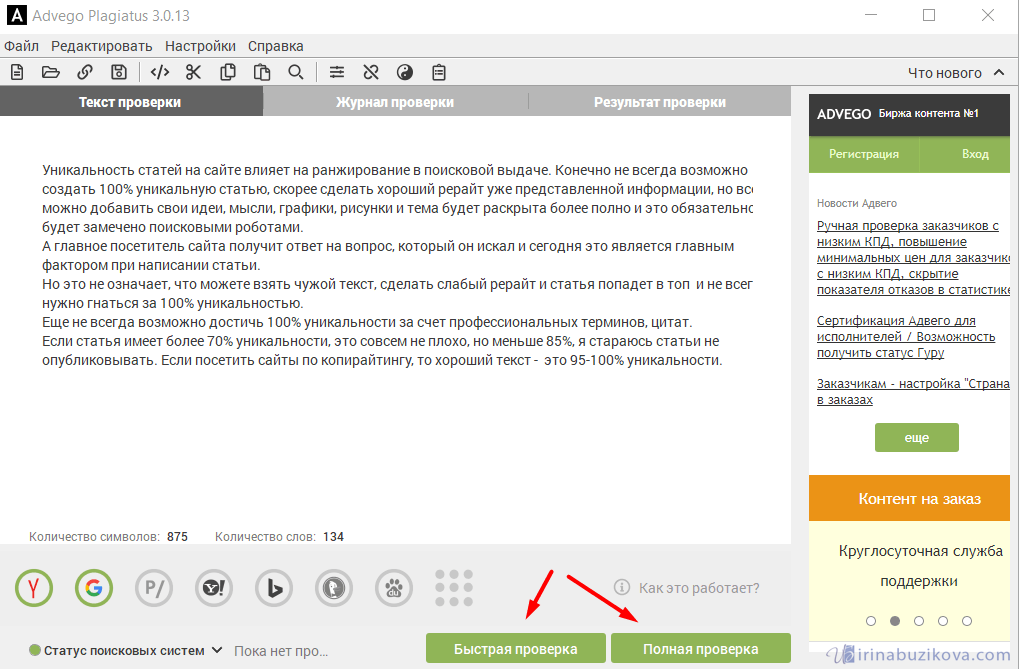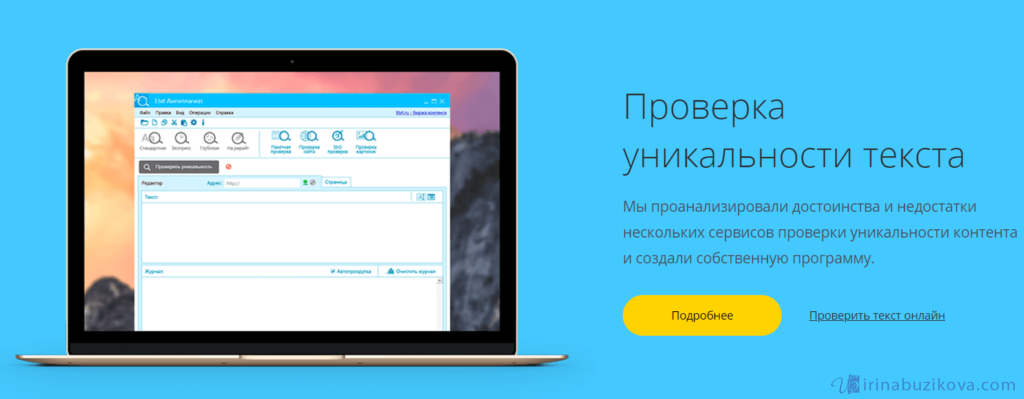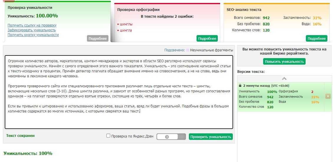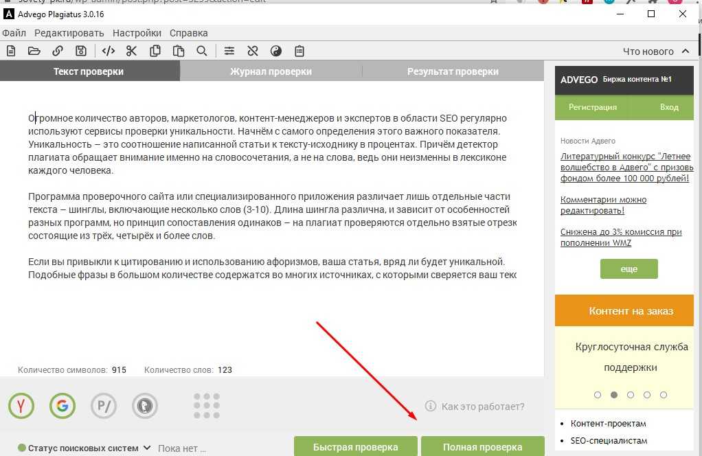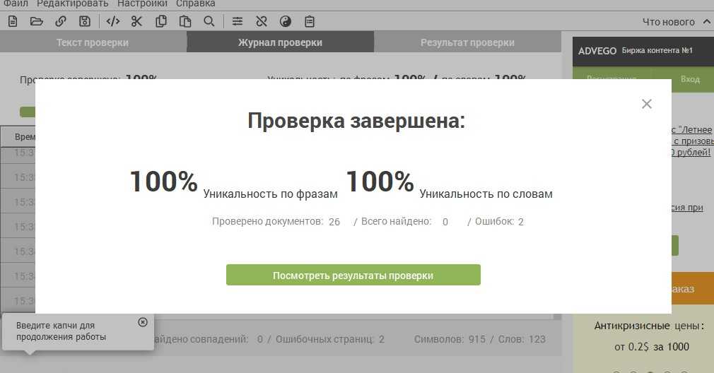 Самая известная, бесплатная программа для проверки уникальности текста. Advego — это прежде всего огромная биржа контента, поэтому в их арсенале есть сильный и отличный инструмент по проверке текста.
