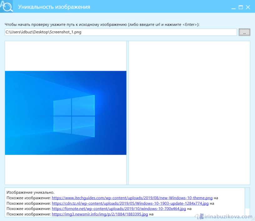 - Уникальность изображений – сейчас очень много магазинов по покупке изображений, поэтому есть возможность проверить уникально ли оно. Меню Операции, пункт Уникальность изображений, далее выбираем изображение и ждем. Процесс не быстрый. Ниже будет указано уникально или нет и будут даны адреса сайтов с похожими или неуникальными изображениями.