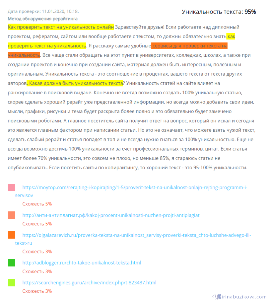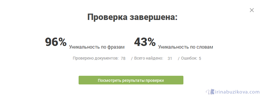 Через некоторое время вы получите результат проверки — уникальность текста, к примеру, вот что получилось у меня: