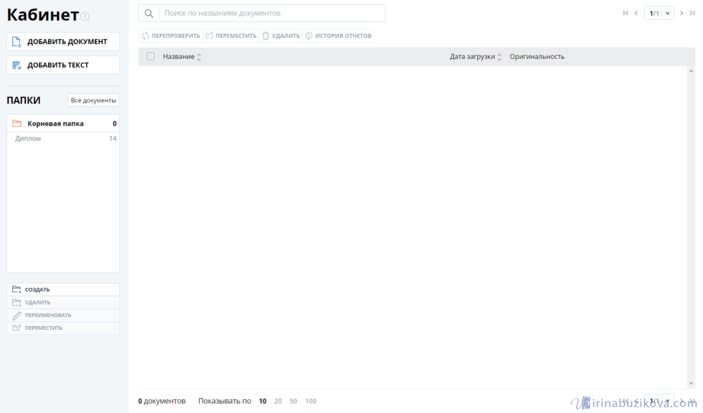 https://www.antiplagiat.ru – быстрый и популярный сервис в России, так как им часто пользуются школьники и студенты. Для получения возможности бесплатно проверить свою работу, необходимо зарегистрироваться. Хочу отметить удобный и необычный интерфейс. Личный кабинет, где есть возможность создать папки для каждого проекта, а также перемещать и удалять проекты.