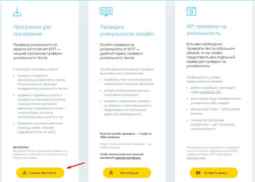 https://www.etxt.ru – сейчас одна из крупных бирж контента, с возможностью бесплатной, онлайн- проверкой текста на уникальность. Без регистрации до 3000 символов, после регистрации – до 5000 символов, этого объема вполне хватит для небольшой статьи в социальные сети. Но факту, для использования бесплатных возможностей необходимо иметь рабочую учетную запись с рейтингом от 20.
