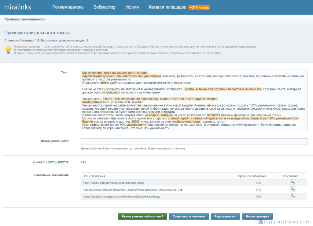 https://www.miralinks.ru – интересный ресурс с возможностью бесплатно проверить текст, но с неудобным интерфейсом, опять нужно понимать, в основном этот сайт направлен на статейный маркетинг и продвижение