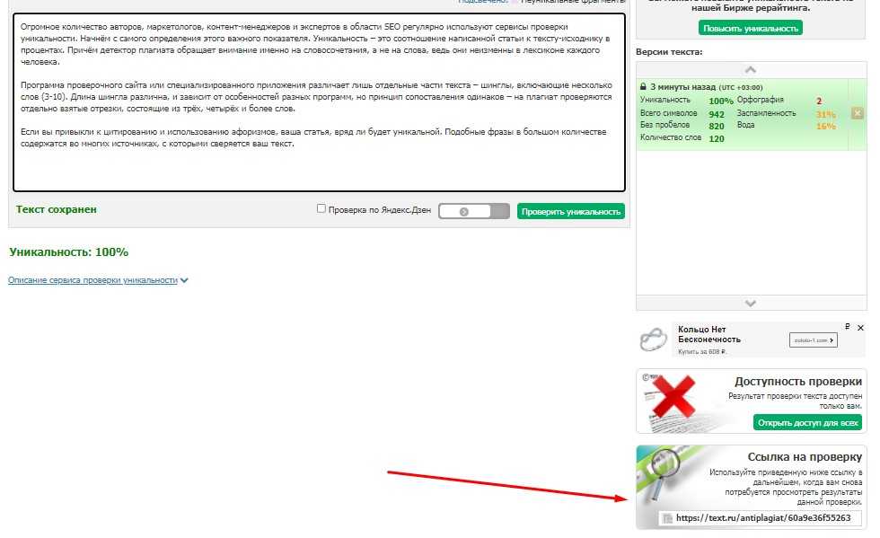 Шаг 4. Чтобы показать заказчику результат, не обязательно делать скриншот, можно взять ссылку, которая размещена на странице проверки текста на уникальность — в правом столбце.