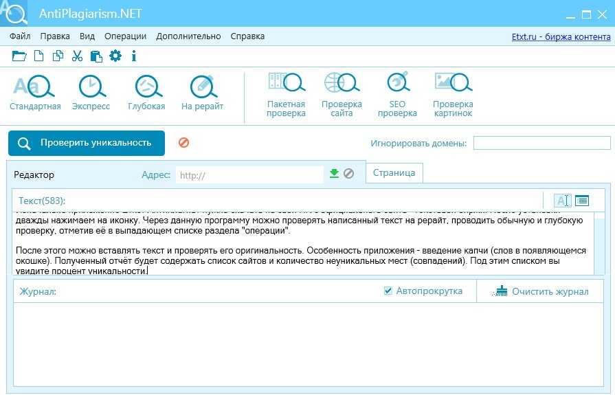 Изначально приложение Еткст Антиплагиат нужно скачать на свой ПК с официального сайта – текстовой биржи. После установки дважды нажимаем на иконку. Через данную программу можно проверять написанный текст на рерайт, проводить обычную и глубокую проверку, отметив её в выпадающем списке раздела «операции».