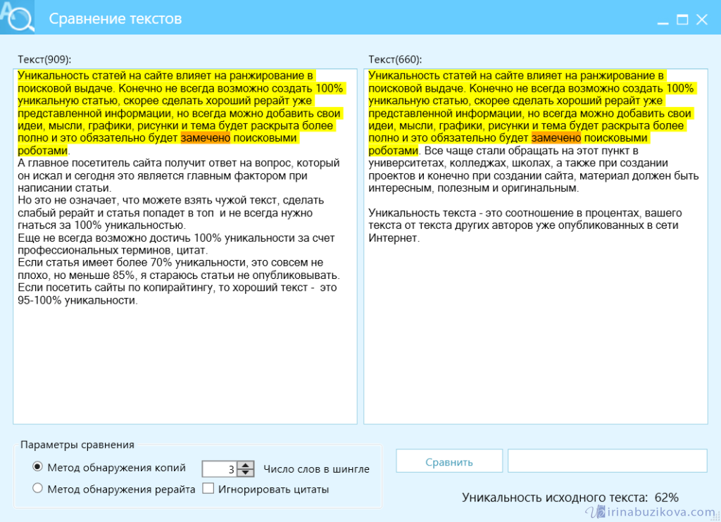 Уникальность текста — это соотношение в процентах, вашего текста от текста других авторов, уже опубликованных Интернет.