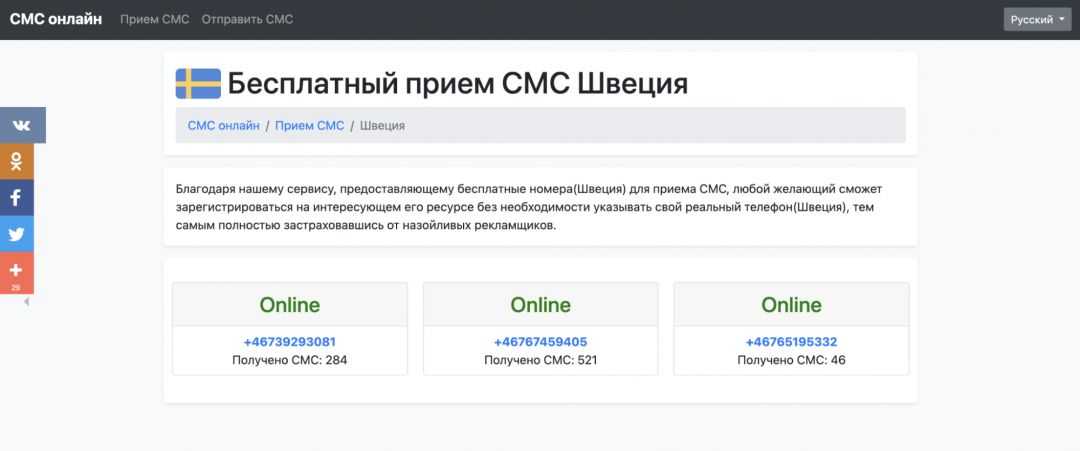 Сервис Receive-sms-online.com работает подобным образом — достаточно зайти и взять любой из восьми свободных телефонов. В отличие от Sellaite, здесь частенько бывают доступны российские и украинские номера.