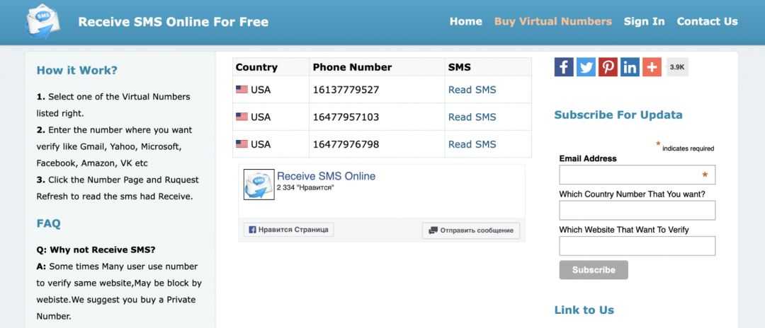 - Receive SMS online for FREE — пара бесплатных ВН США, остальные доступны по подписке от $5 в месяц.