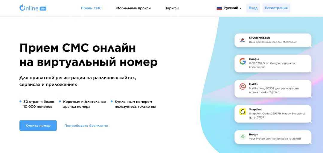 OnlineSim.ru — классический платный, но недорогой сервис для регистраций на интернет-площадках. Предоставляет следующие возможности: