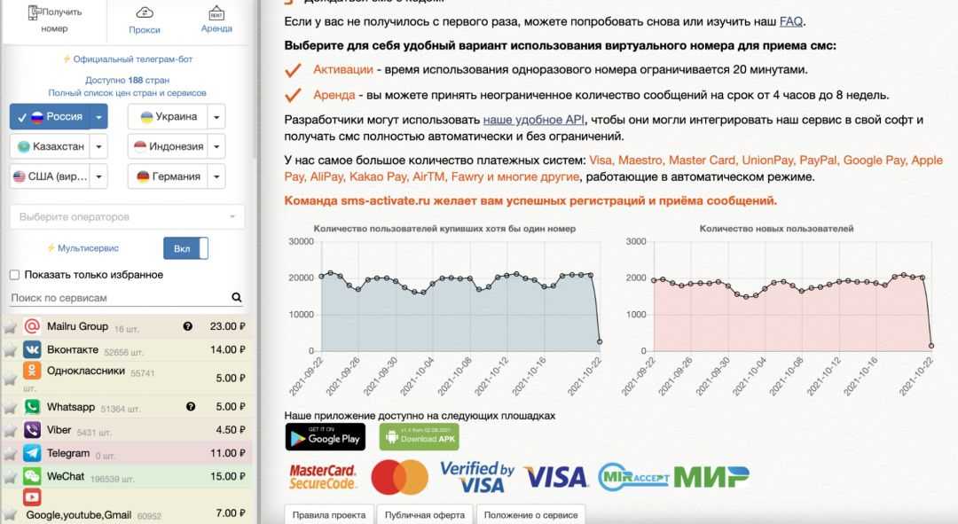 - sms-activate.ru – 70+ стран, имеется API, возможность повторного приема СМС, аренда номера