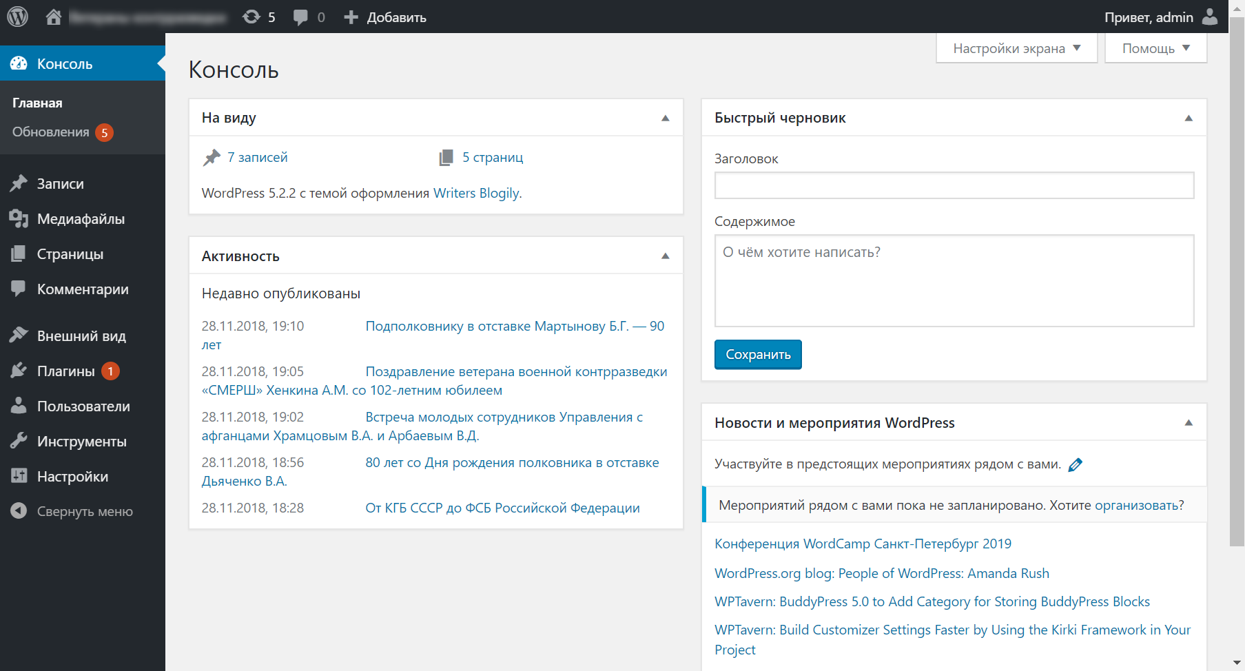 Начальная страница стандартной панели администрирования Вордпресса.