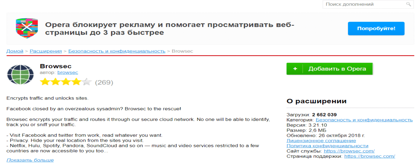 Можно скачать с официального сайта browsec.com либо через саму Оперу.