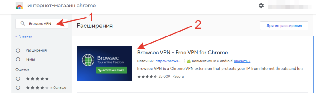 Шаг 1. Выбрать пункт Расширения — Загрузить расширения. В поиске пишем Browsec.