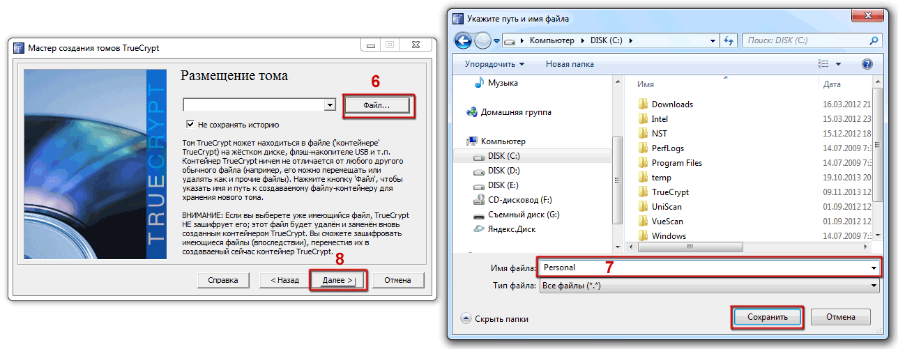 3. Нажмите кнопку “Файл…” и укажите путь (место в где будет находится файл) и название файла. Введите любое понравившееся Вам имя, например Personal. Для продолжения нажмите кнопку “Далее”.