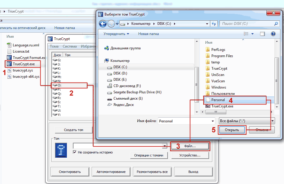 И так, для того чтобы подключить созданный нами файл Personal, необходимо запустить файл TrueCrypt.exe, из разархивированной папки.