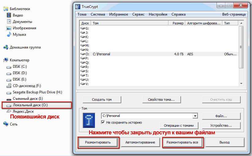 2. Нажмите кнопку “Смонтировать”, введите пароль и нажмите кнопку “ОК”. Закроется окно ввода пароля и в проводнике появится новое устройство “Локальный диск (О:)”, с которым вы можете работать также как с обыкновенным разделом жесткого диска.