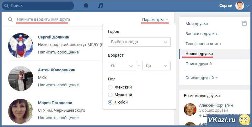 Обратите внимание: Несмотря на то, что на данной странице сверху и справа имеются всевозможные фильтры, они никоим образом не позволяют фильтровать список возможных друзей. То есть, если вы воспользуетесь поиском сверху и, например, постараетесь найти всех возможных друзей с именем «Сергей», социальная сеть просто начнет искать пользователей с именем «Сергей» в своей базе данных, не ориентируясь на подобранный для вас список возможных друзей