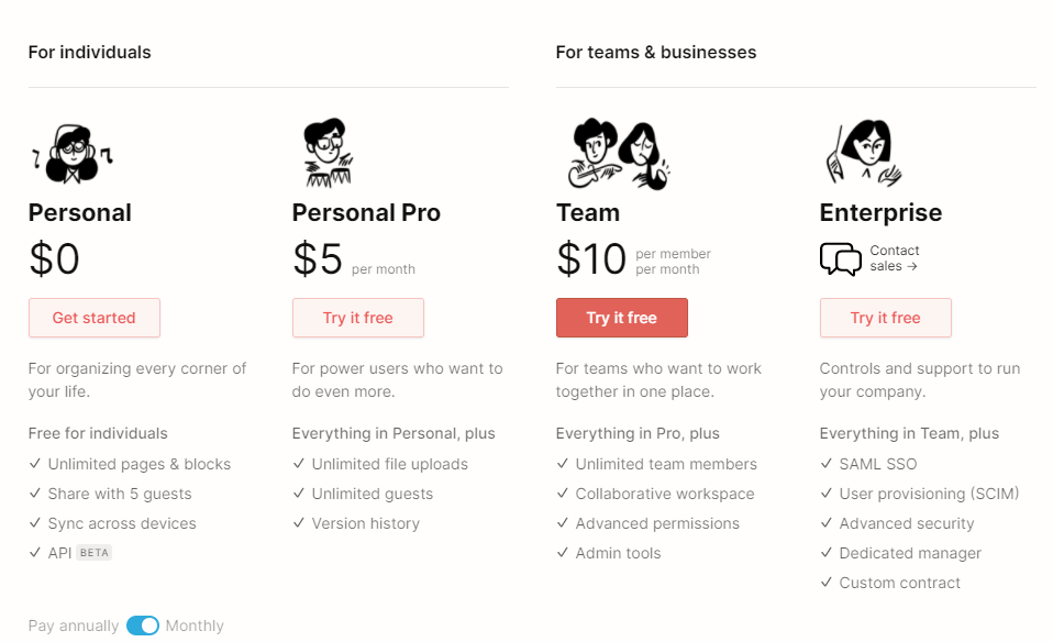 - Personal Pro ($5 в месяц) — все инструменты, нет ограничений по объему загружаемой информации, количеству гостей, просмотру страниц, есть сохранение истории версий за последние 30 дней.