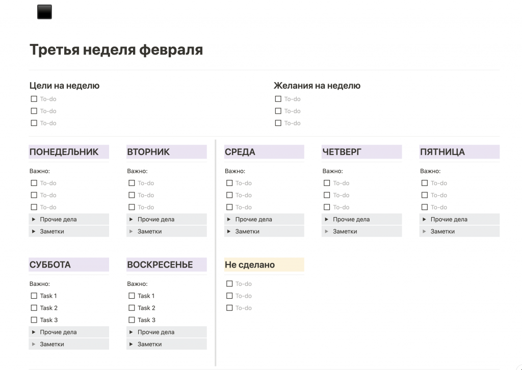 Так выглядит разворот на одну неделю. Если в бумажном блокноте нужно чертить и заполнять развороты каждую неделю, то в Notion можно дублировать шаблон, просто изменить старые даты на актуальные. Хотя некоторым пользователям bullet-journal, наоборот, важен процесс оформления. Прорисовывать элементы, чертить, придумывать дизайн – это медитация и творчество, а не только планирование.