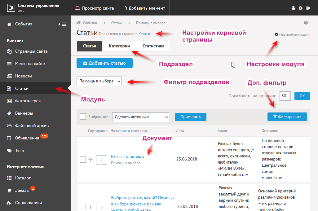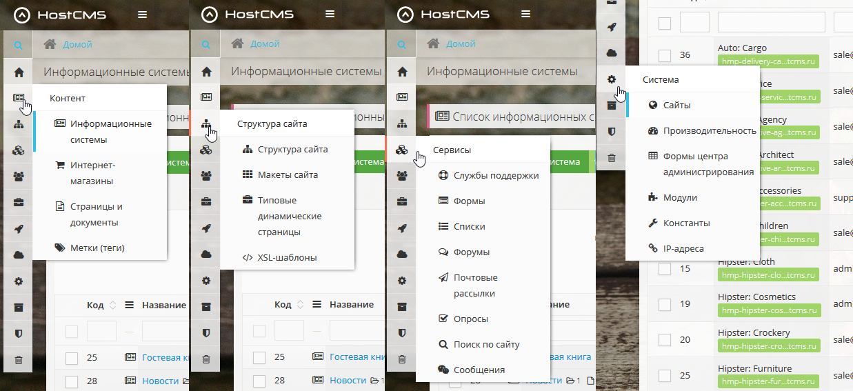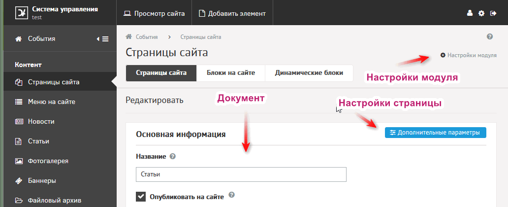 - Администрирование — доступ к панели администрирования, позволяющей управлять сайтом.