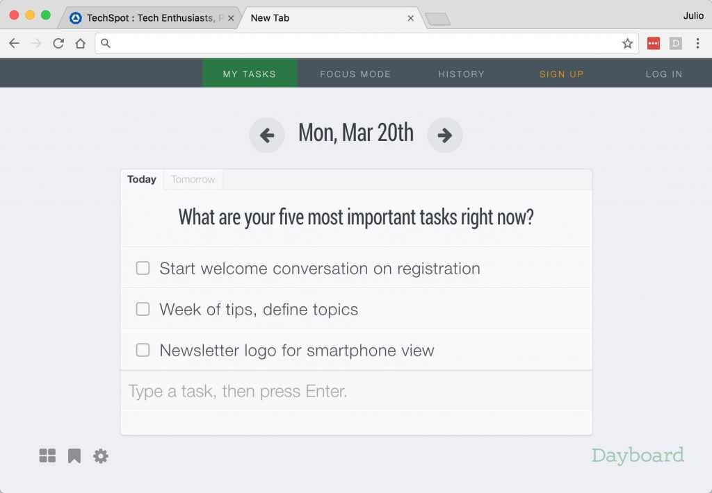 Dayboard – популярное расширение, которое заменяет вашу новую вкладку минимальным списком дел. Его идея состоит в том, чтобы установить до 5 целей каждый день и вычеркнуть их одно за другим при этом отвлекаясь как можно меньше. Dayboard будет вести историю, покажет прогресс и может синхронизировать цели на разных компьютерах.