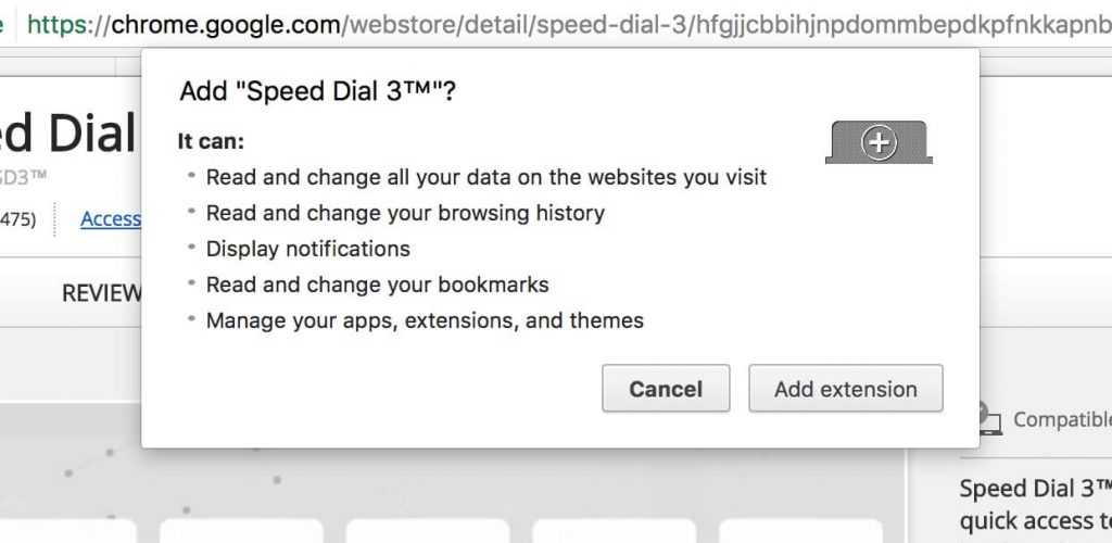 Стоит отметить, что надо бы обратить пристальное внимание на разрешения, которые потребуются некоторым расширениям. Например, расширение под названием «Speed Dial 3», (и которое мы бы не рекомендовали устанавливать) предлагает быстрый доступ к вашим приложениям, закладкам и истории, но оно может считывать и изменять Ваши данные на посещаемых веб-сайтах, закладках, а также историю просмотров. Конечно, ради удобства можно кое-чем и пожертвовать, но просто постарайтесь учесть все за и против, прежде чем добавлять то или иное расширение