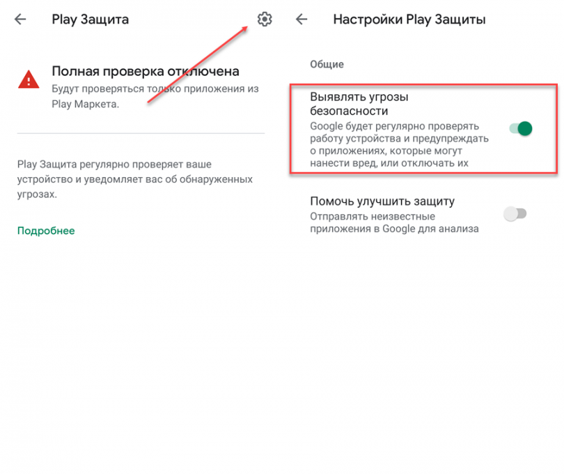 Шаг 2. Нажмите на значок в виде шестеренки, чтобы перейти в настройки. Здесь передвиньте ползунок «Выявлять угрозы безопасности» в состояние включено.