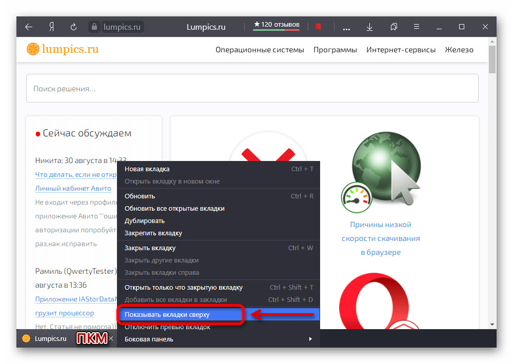- В любом месте рассматриваемой панели кликните правой кнопкой мыши и воспользуйтесь опцией «Показывать вкладки сверху». После этого внешний вид интерфейса изменится соответствующим образом.