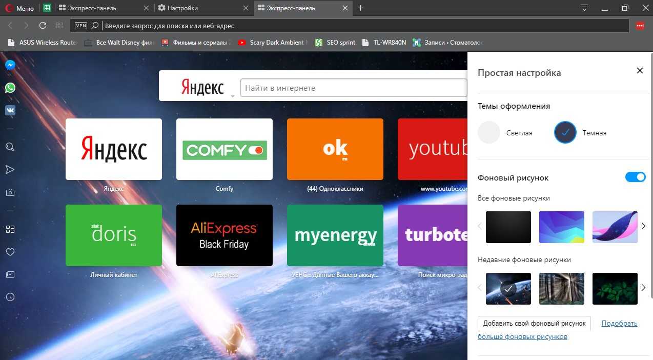 - Доступен выбор темы, светлой или темной. Пусть это и не относится к экспресс-панели, однако это напрямую влияет на визуальное восприятие браузера. Выбирайте ту, при которой вам более комфортно.