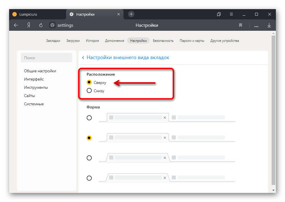 Установите маркер рядом с пунктом «Сверху» в подразделе «Расположение», чтобы изменить параметры. Новые настройки сохраняются автоматически, и потому интерфейс сразу же вернется в прежнее состояние.