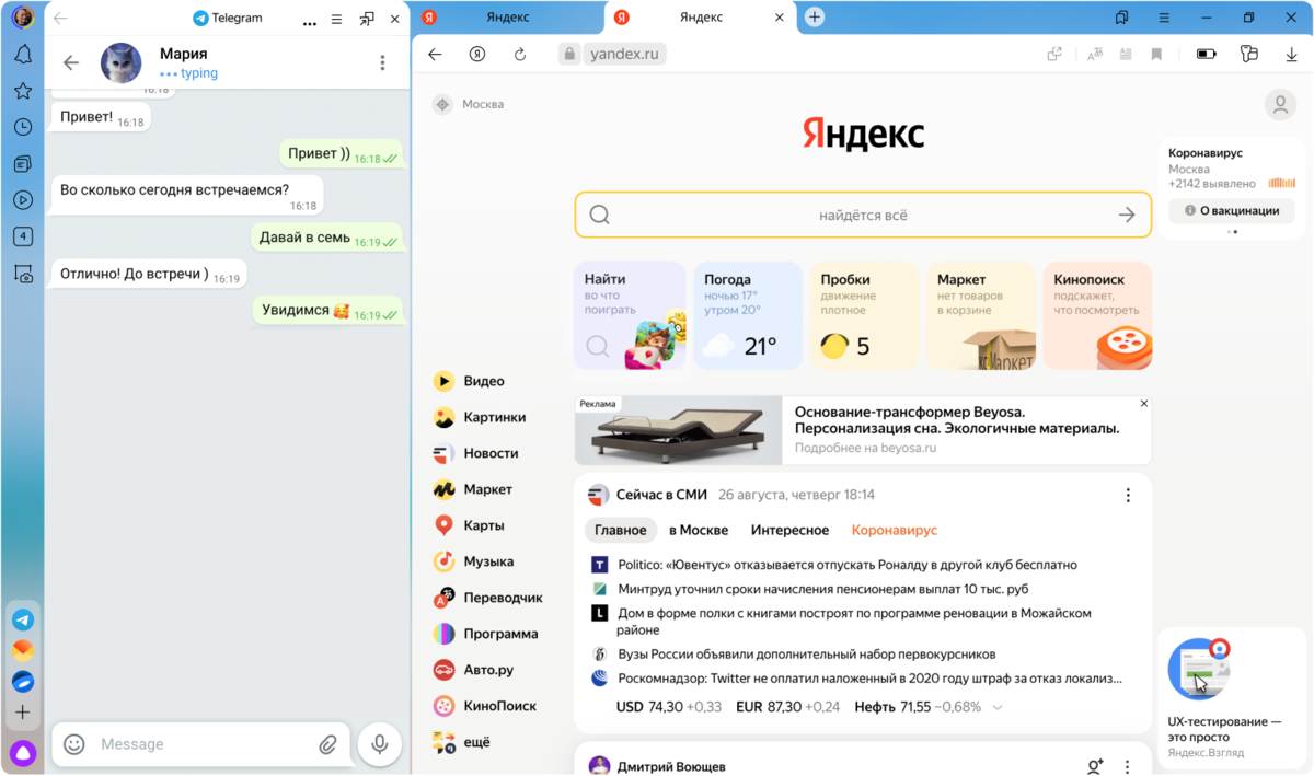 Вы можете открыть приложение одновременно с любой другой вкладкой в режиме разделения окна на две части. Например, запустить таким образом мессенджер: искать информацию в интернете и тут же отвечать коллегам.