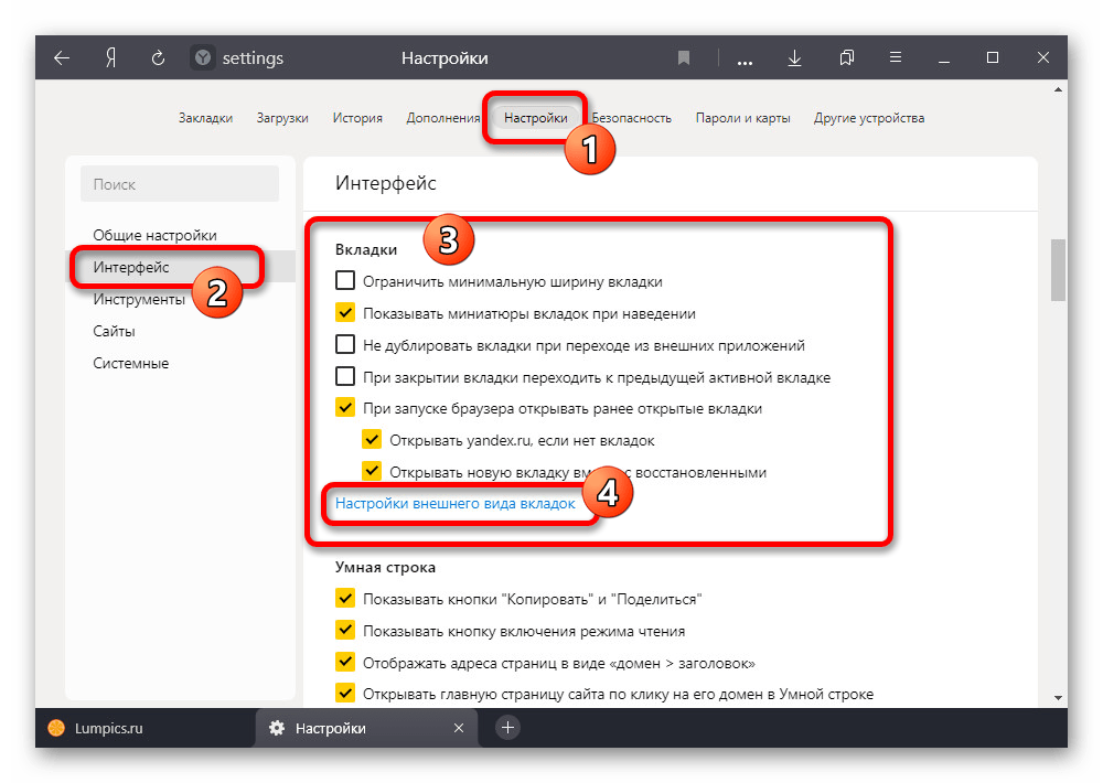 С помощью панели в левой части страницы переключитесь на вкладку «Интерфейс» и найдите блок «Вкладки». Здесь необходимо воспользоваться ссылкой «Настройки внешнего вида вкладок».