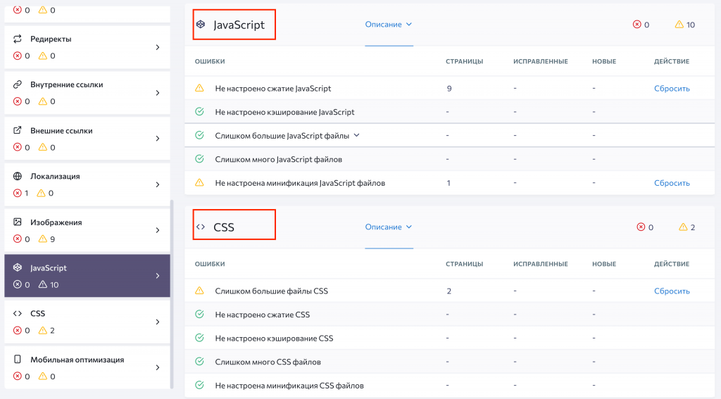 Проверить, есть ли у сайта проблемы со скоростью загрузки, вы можете в инструменте «Аудит сайта» в разделе «Скорость» отчета об ошибках. Здесь же можно увидеть, оптимизированы ли у сайта CSS- и JS-файлы.