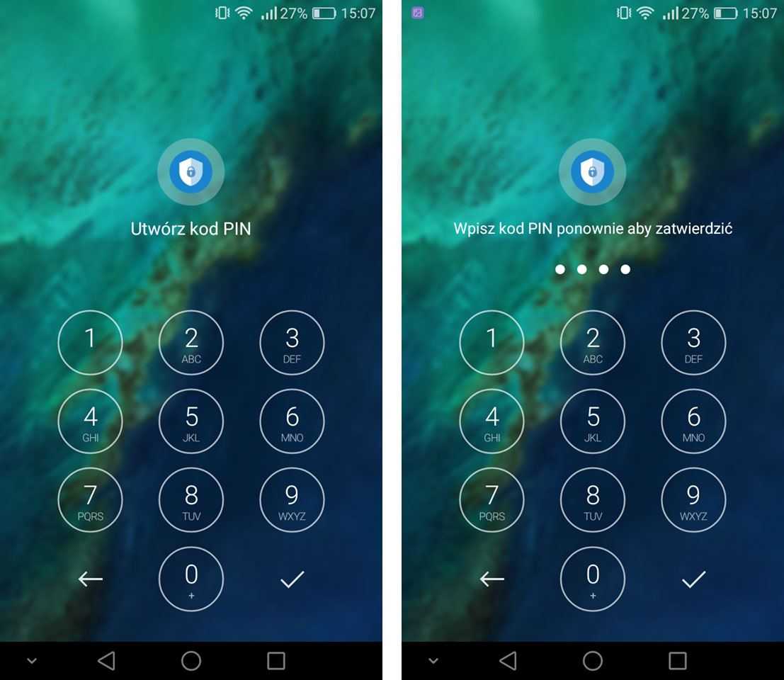 После первого включения нам будет предложено создать PIN-код, который мы хотим заблокировать доступ к различным функциям телефона. Создайте PIN-код, дважды введя его и подтвердив птицей в нижнем правом углу.