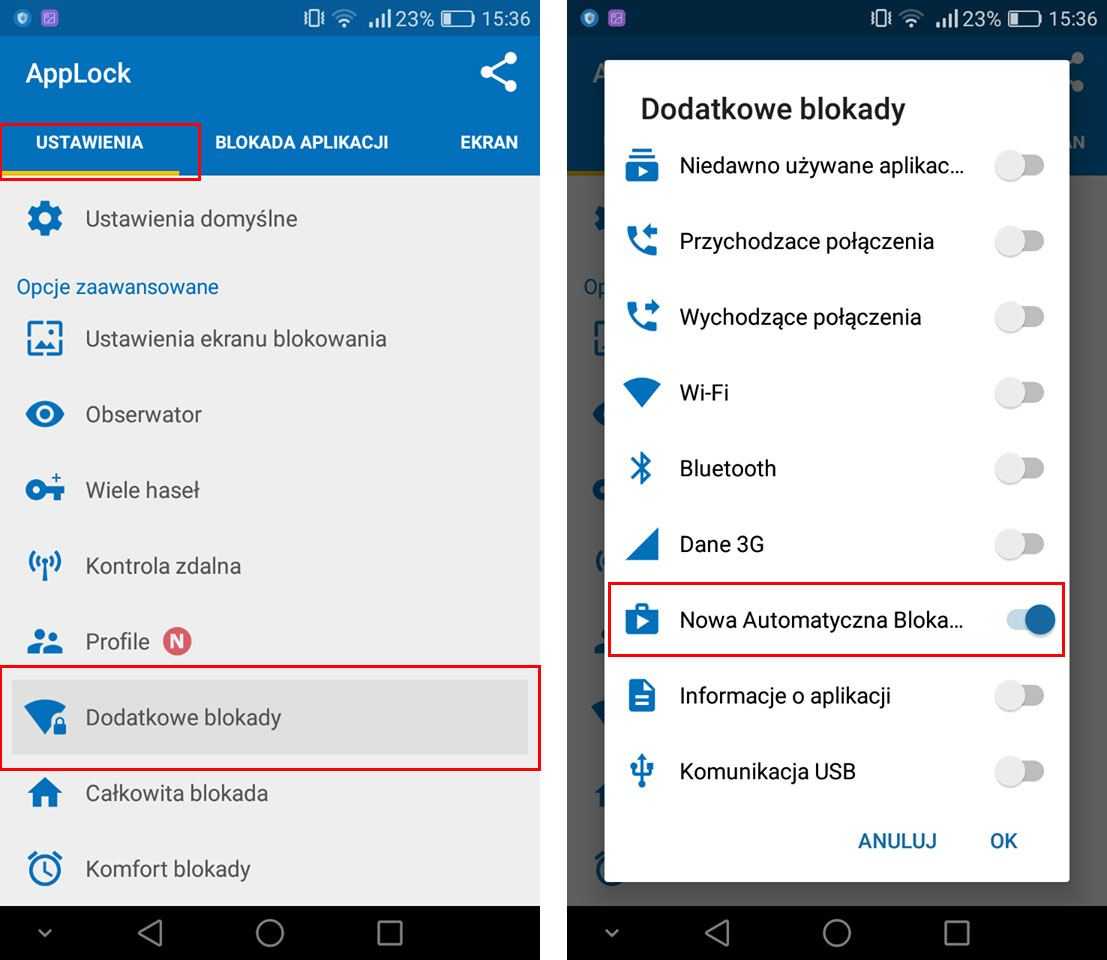Появится новое окно, в котором вы можете активировать альтернативные варианты блокировки различных функций на вашем телефоне. В списке вы найдете опцию с именем «Новая автоматическая блокировка приложения» (полное название части не подходит) со значком Play Маркета. Проверьте этот параметр.