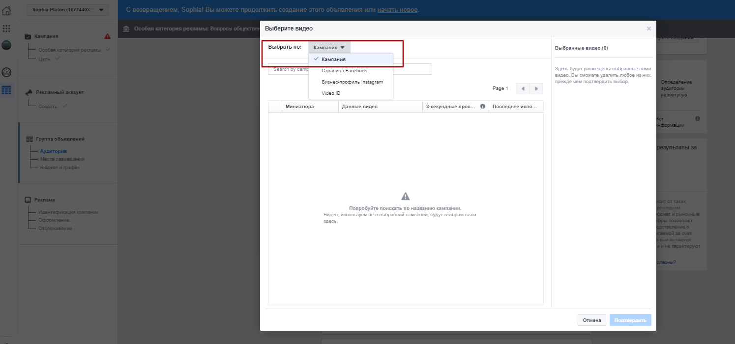 В разделе «Выбрать по» отметьте в выпадающем списке «Кампания», чтобы собрать тех, кто видел ролики из объявлений.