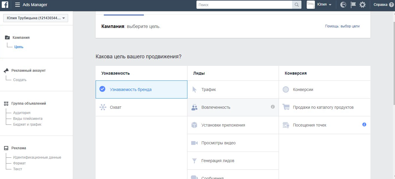 Основа создания рекламной кампании — это выбор цели, которой вы хотите достичь. Facebook предлагает на выбор множество вариантов. Но для тех, кто создает рекламу впервые, этот выбор может показаться сложным. Если вы новичок в этом деле, нажмите кнопку Помощь → выбор цели и прочитайте справа подсказки. Кроме того, на всех этапах создания рекламы можно прочитать дополнительную информацию о каждой из опций. Для этого просто наведите на нее курсор мыши.
