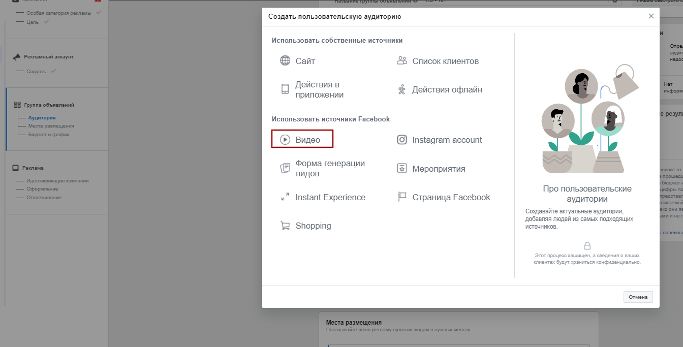 Этот тип источника позволяет создать пользовательскую аудиторию из тех, кто посмотрел видео на Facebook или в Instagram. Это могут быть видео, которые отображались в ленте, Stories и других плейсментах обеих соцсетей.