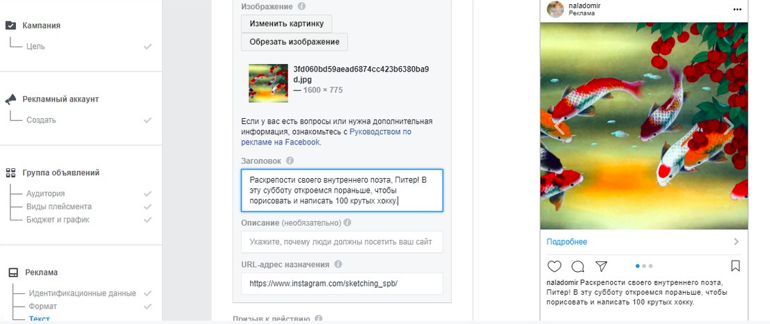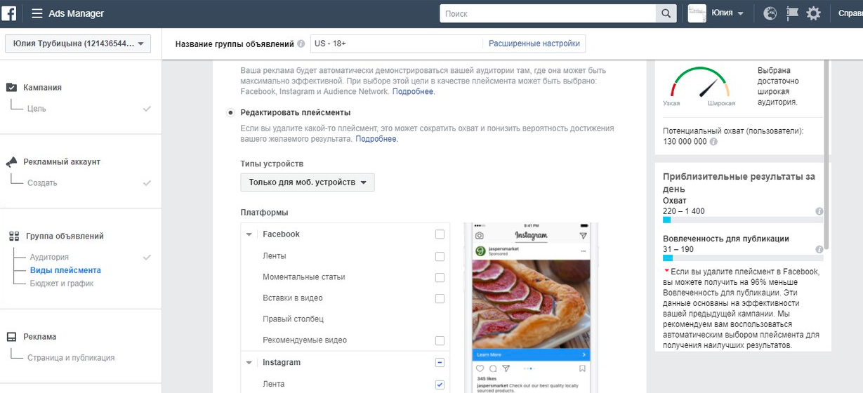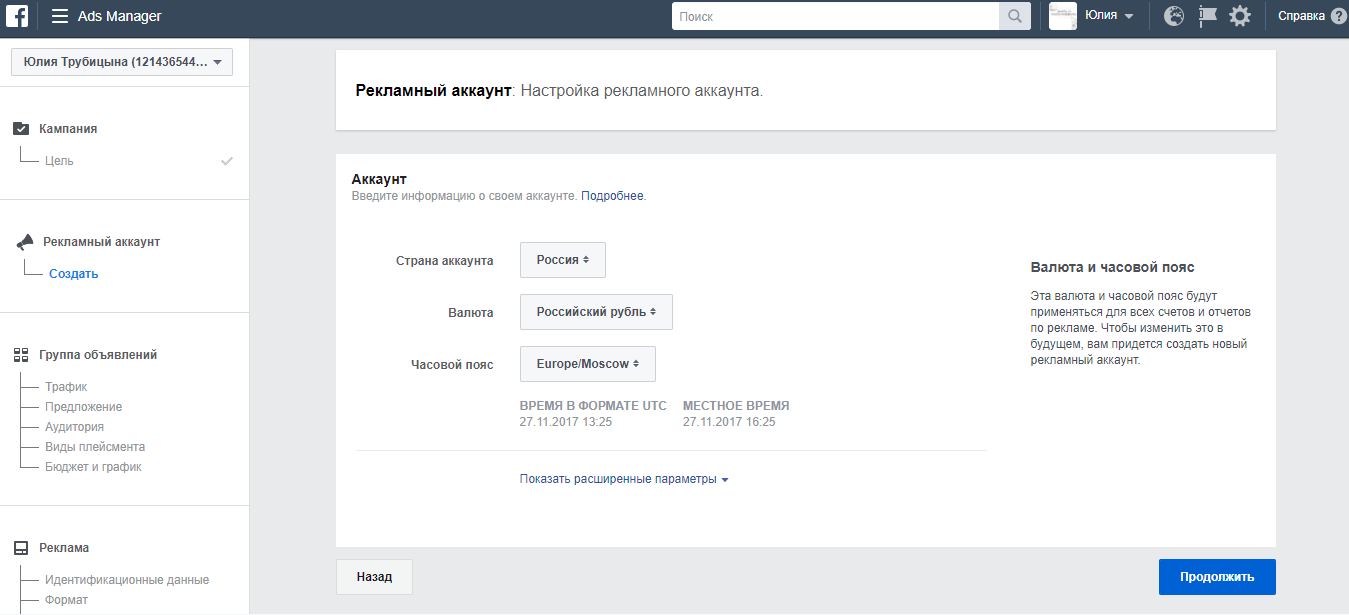 Так как у Instagram и Facebook один рекламный кабинет, некоторые шаги в настройке дублируются, но для удобства мы не станем их пропускать.