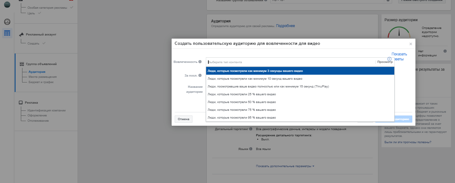 Затем в поле «Вовлеченность» из выпадающего списка выберите тип пользователей, который вы хотите использовать для создания аудитории, например, «Люди, которые посмотрели минимум 3 секунды вашего видео».
