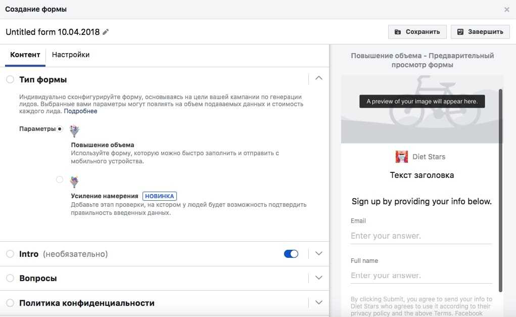 Эта цель рекламной кампании успешно работает для генерации лидов непосредственно в самом Facebook без привлечения трафика на ваш сайт за пределы социальной сети. Facebook предоставляет инструменты, которые можно использовать в рекламных кампаниях для сбора информации: номер телефона, адрес электронной почты, ответы на специальные вопросы и тд. То есть вы получаете возможность сабмита формы, интегрированной непосредственно в ваш креатив.