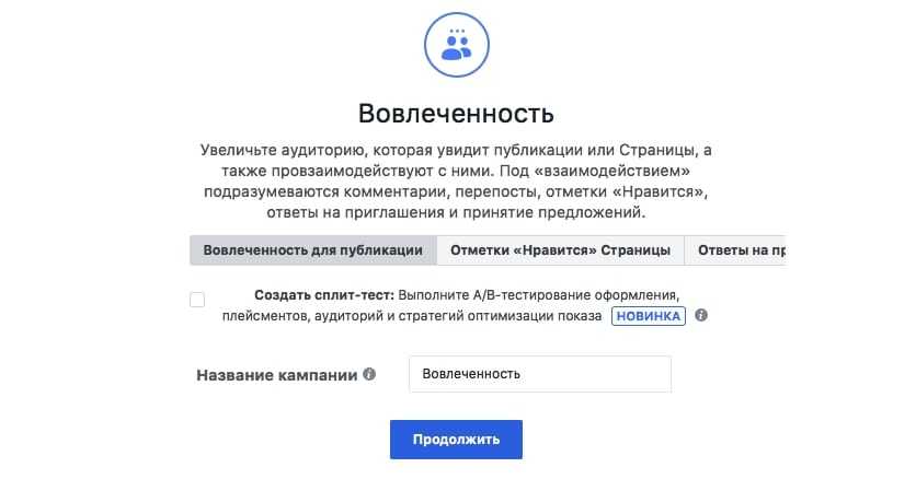 Используйте этот пункт, если хотите, чтобы как можно больше людей взаимодействовало с вами при помощи различных реакций (лайков, комментариев, репостов и т.д.). Также «Вовлеченность» подходит, если нужно больше отметок «Нравится» для страницы, реакций на какой-либо ивент или ответов на приглашения.