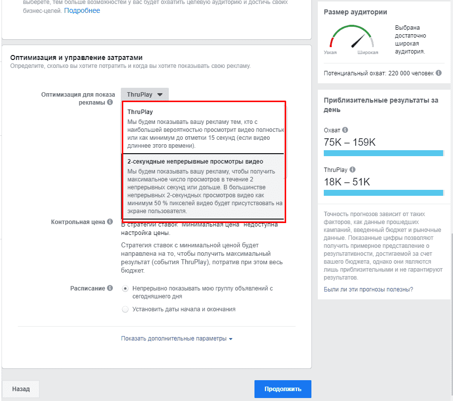 - ThruPlay. Увеличивает количество полных или частичных просмотров, которые длятся не менее 15 секунд.