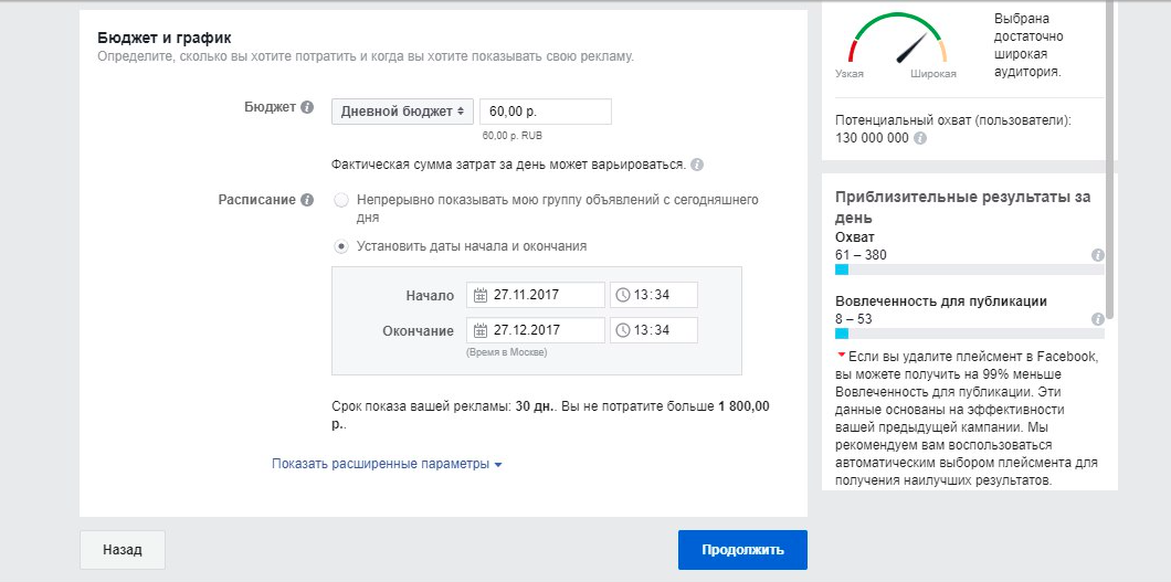 - выбор аудитории и мест показа рекламы, выбор бюджета и заполнение; расписание (тут вам и пригодится информация, полученная из статистики);