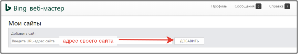 Как и в прошлых случаях, в поле, нужно ввести адрес Главной страницы Вашего сайта и нажать кнопку Добавить сайт.